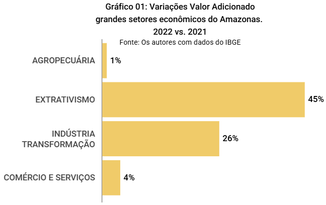 - Em mais detalhes, o acréscimo de 45% no extrativismo, à época, partiu de uma diminuta base de comparação. O extrativismo contribuía com R$ 2,5 bilhões na formação do Valor Adicionado do Amazonas. Em 2022 este volume aumentou para R$ 3,7 bilhões. Já os 27% de aumento no valor adicionado da Indústria da Transformação correspondeu a acréscimo de R$ 8 bilhões sobre os R$ 30,14 bilhões registrados no ano anterior;